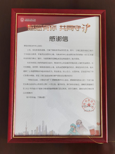 近日,株洲市中心血站收到来自上海市血液中心邮寄过来的感谢信,向关心和援助上海市临床用血的株洲人民最诚挚的感谢。