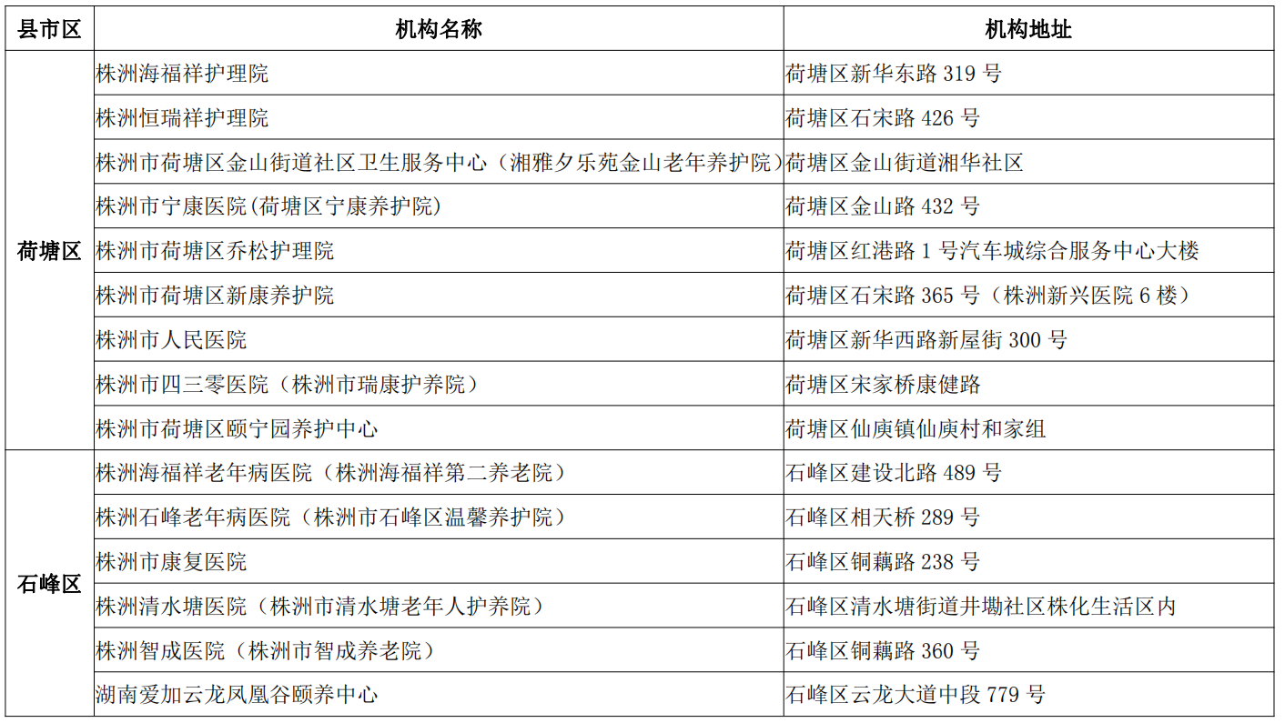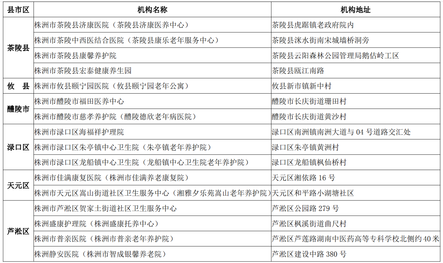 根据《关于做好医养结合机构审批登记工作的通知》(国卫办老龄发〔2019〕17号)等文件要求,现将株洲市31家医养结合机构信息(截至2022年12月)向社会公示如下: