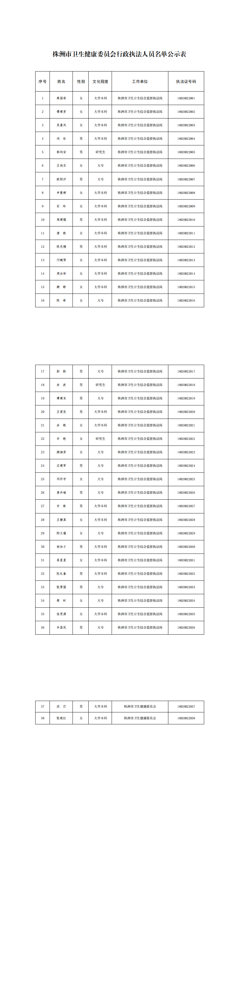 株洲市卫生健康委员会行政执法人员名单公示