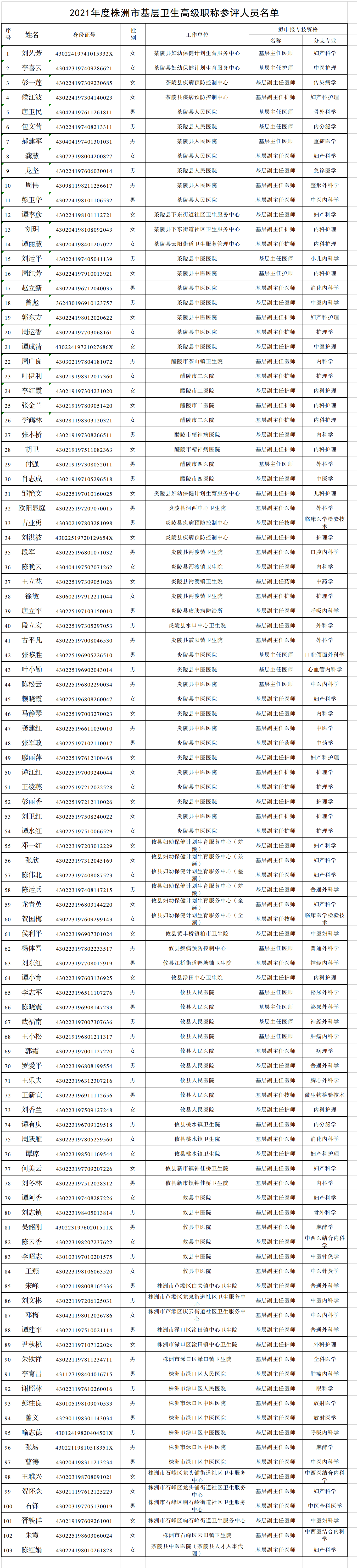 根据株洲市基层卫生高级职称评审工作安排,现将2021年株洲市基层卫生高级职称符合参评资格的人员名单进行公示,公示期为11月30日-12月6日。请各位参评人员仔细核对,如有错误请于12月6日前将信息报各县市区卫健局。