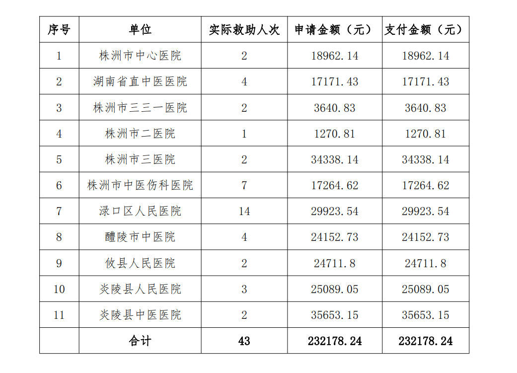 根据《株洲市疾病应急救助制度实施细则(试行)》(株卫发〔2015〕12号)文件要求,经市卫健委、市财政局、市公安局、市民政局、市医保局联合审核确认,2023年度共有11家医院申报基金拨付,共计救助43人次,资金总额232178.24元,已予拨付。截至目前,基金结余767.7万元。